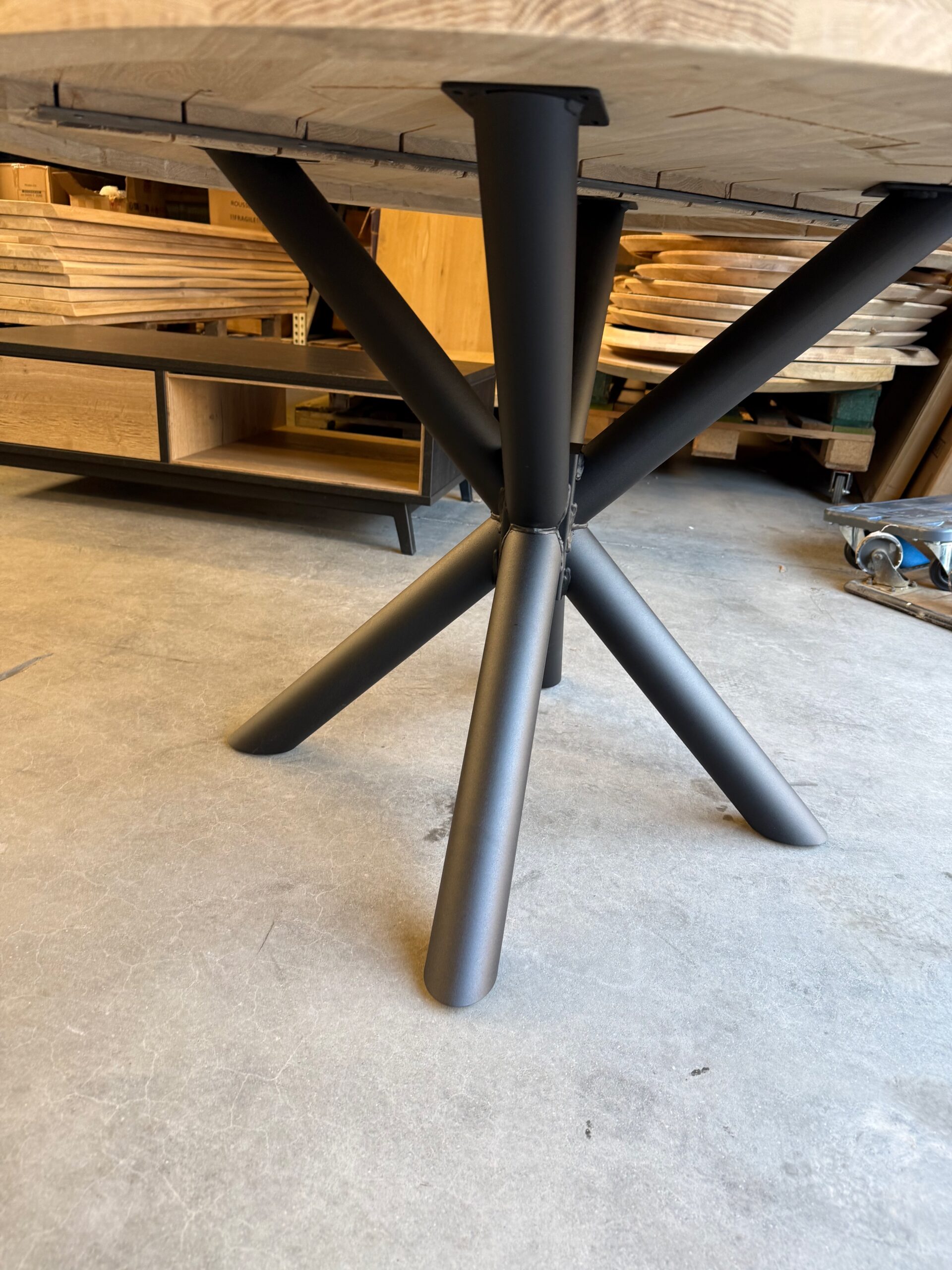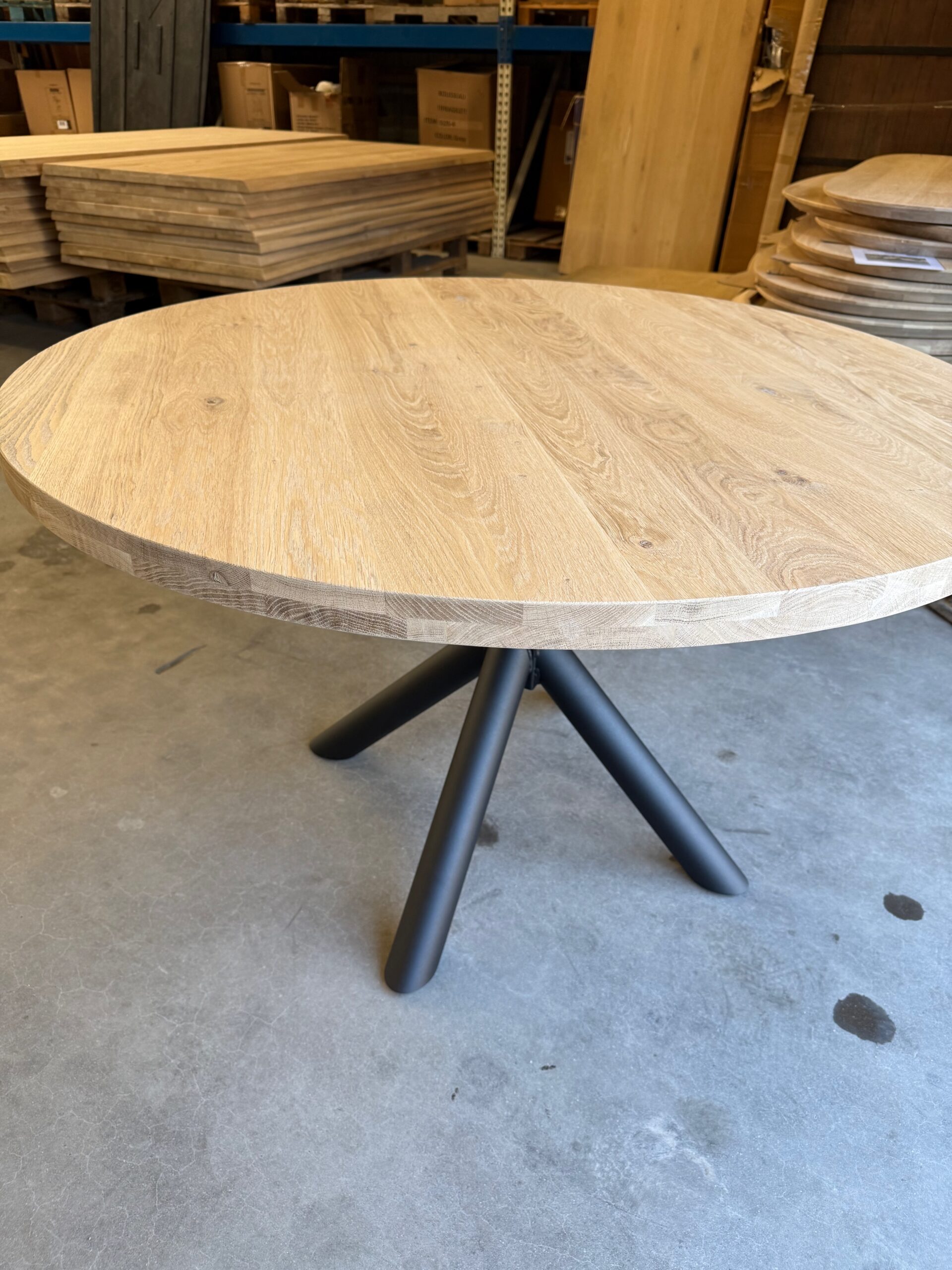 De ronde eetkamertafel Aerts met een metalen spinpoot en massieve blad een echte eyecatcher voor ieder interieur.