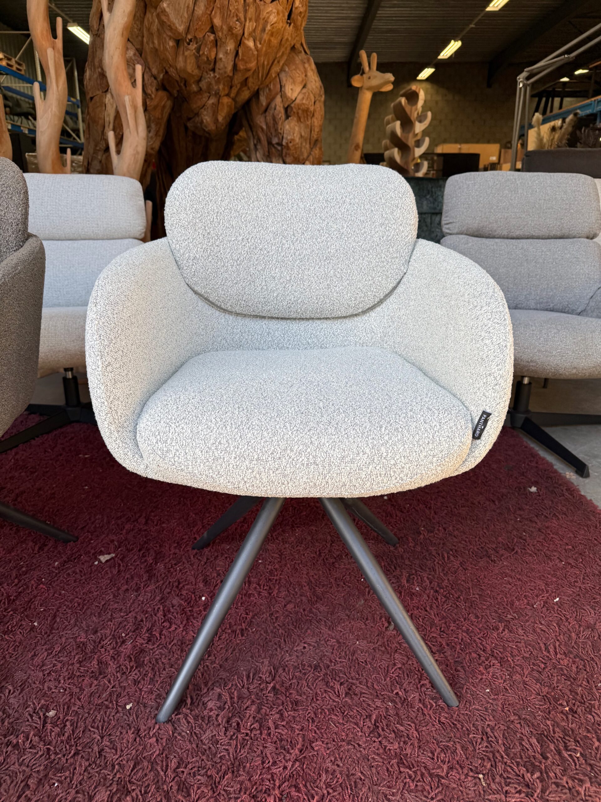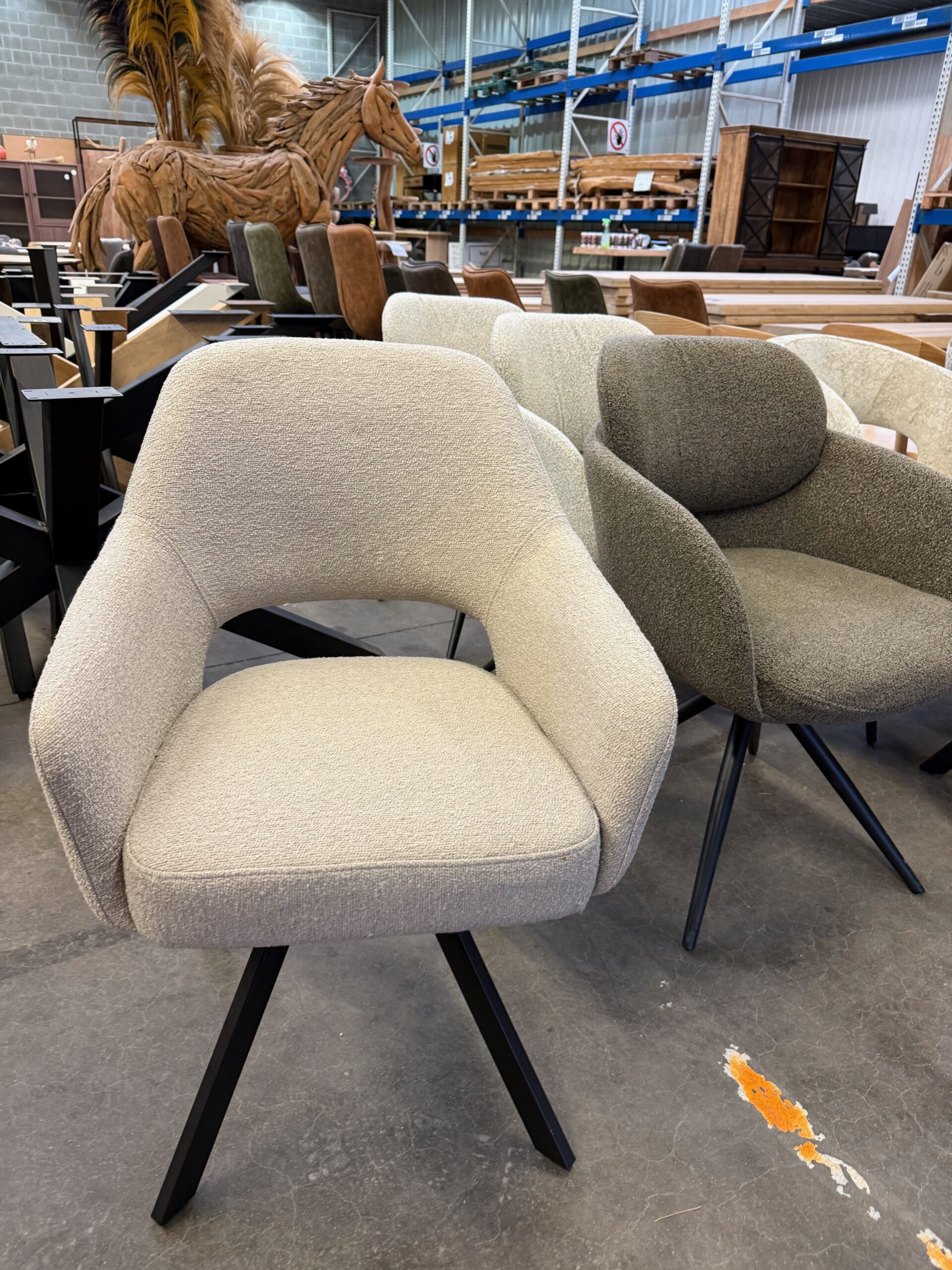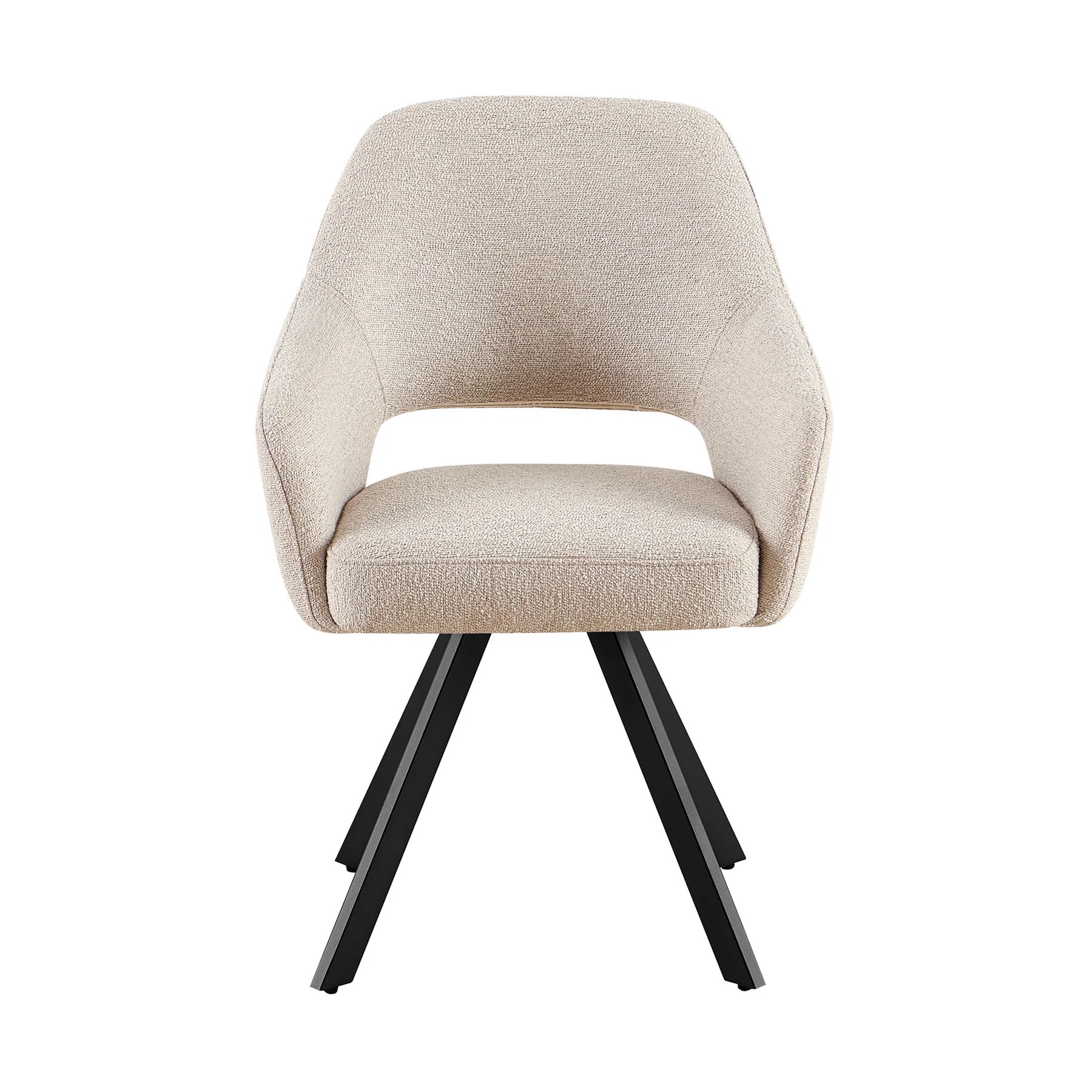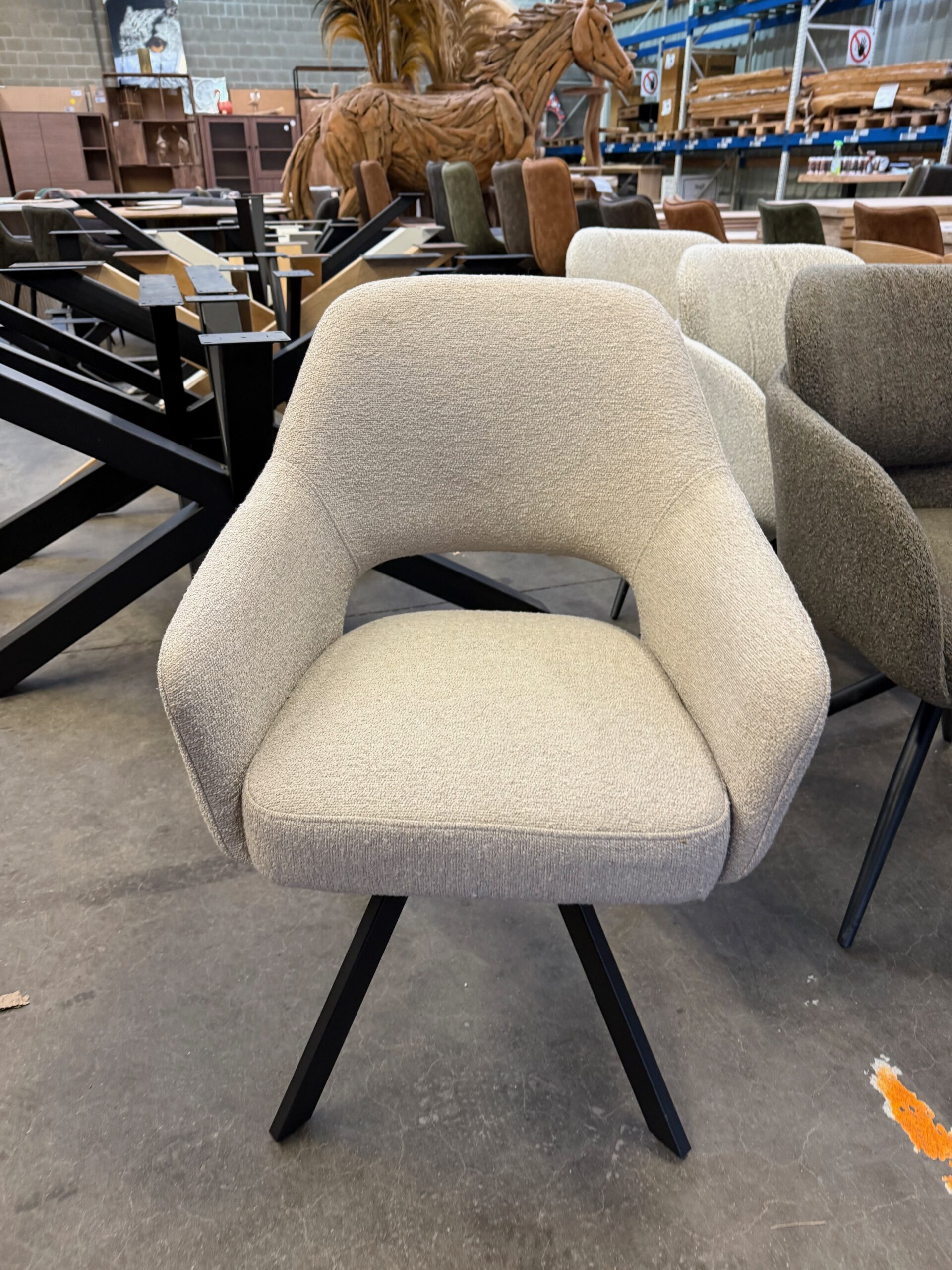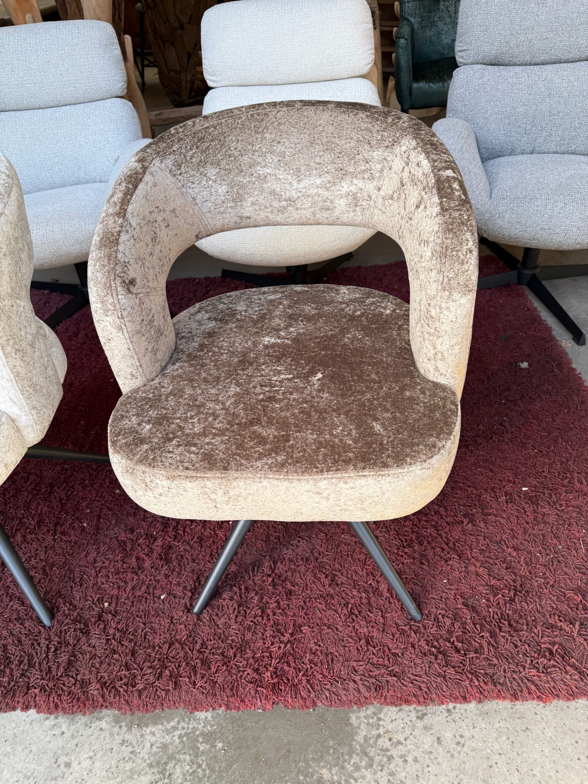 De Emilie is voorzien van zwarte metalen poten en een 180 graden draaifunctie met terugdraaisysteem, zodat de stoel altijd netjes terugdraait naar de oorspronkelijke stand.